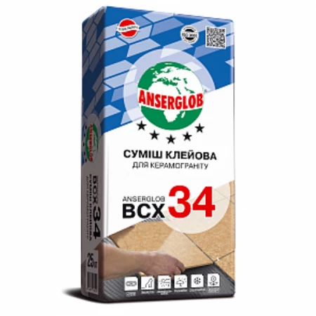 Клей для керамограніта ANSERGLOB BCX 34 використовується для приклеювання плиток великих розмірів на покриття для підлоги всередині і зовні будинків. Застосовується для облицювання підлоги з підігрівом. Призначений для облицювання керамічною плиткою, штучним каменем, керамогранітом. Використовується в житлових і промислових будівлях, на терасах, балконах.